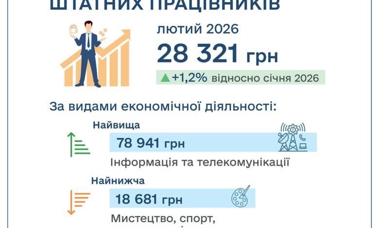 У лютому 2026 року, за даними Держстату, середня заробітна плата в Україні зросла до 28 321 гривні, що на 1,2% більше порівняно з січнем.