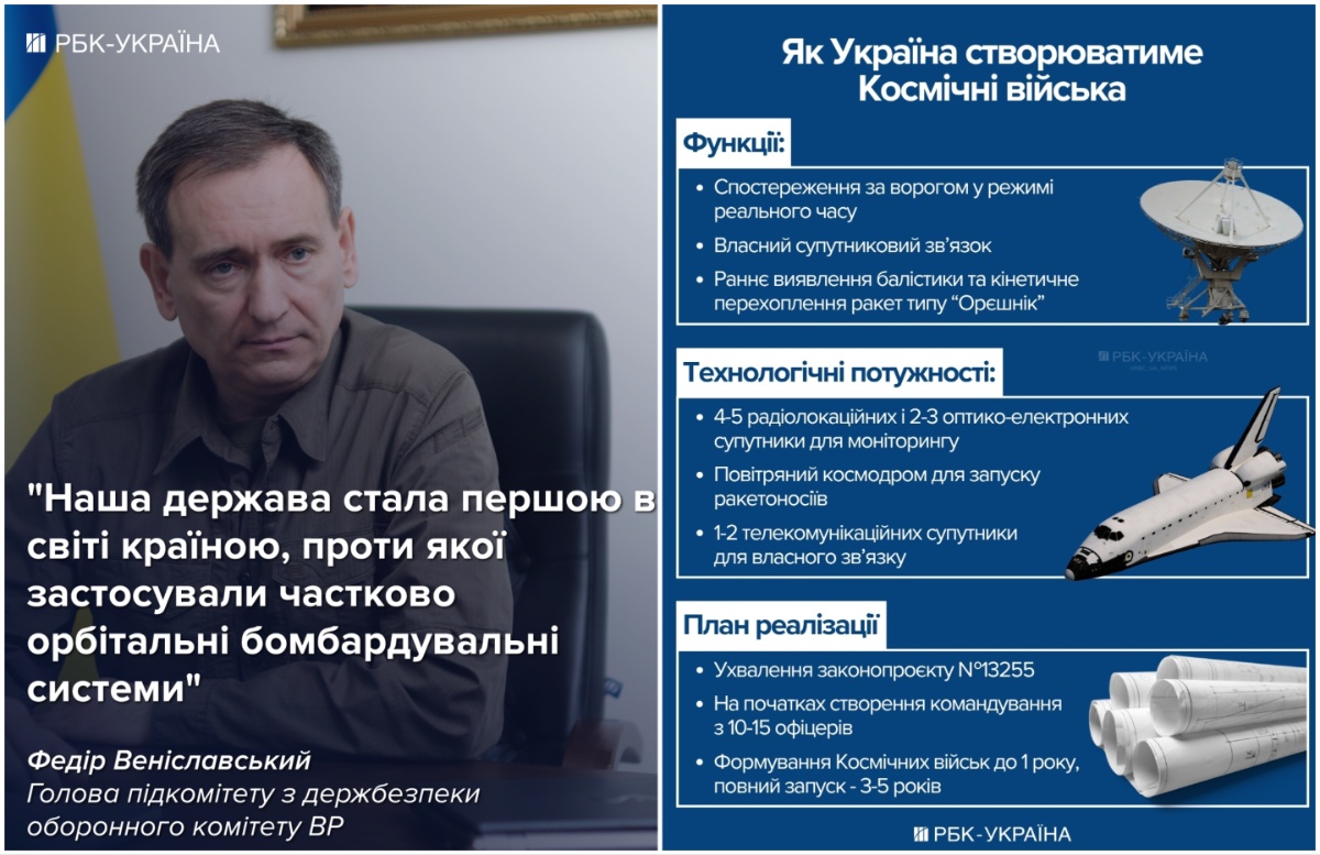 13 квітня 2026 року видання РБК-Україна оприлюднило інтерв’ю з народним депутатом Федором Веніславським, у якому він заявив, що Україна готується до створення Космічних Сил як окремого виду у складі ЗСУ. За його словами, нова структура має дати державі власну космічну розвідку, супутниковий зв’язок і спроможність реагувати на нові типи ракетних загроз, зокрема на системи типу “Орєшнік”.