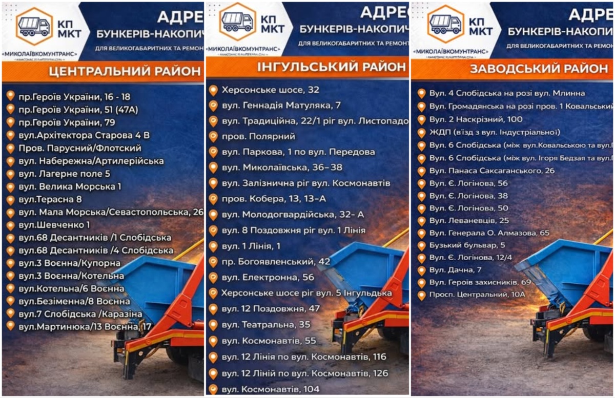 Бункери встановлені у Заводському, Центральному та Інгульському районах. Чомусь КП “Миколаївкомунтранс” вирішило, що Корабельний район не потребує таких бункерів. Частина адрес збігається з дислокацією контейнерів для збору великогабаритних відходів, оприлюдненою на офіційному сайті підприємства.