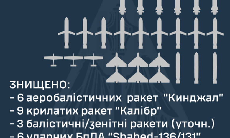 “З шести літаків МіГ-31К було випущено шість аеробалістичних ракет Х-47М2 “Кинджал”, 9 крилатих ракет «Калібр» – з кораблів у Чорному морі та три ракети наземного базування (С-400, “Іскандер-М”). Усі ракети знищено силами та засобами протиповітряної оборони Повітряних Сил ЗС України”, – йдеться у повідомленні.