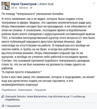 — Я этого заявления так и не видел, которое было подано столь театрально в эфире. Видимо, это сделано исключительно ради шоу. Игорь Николаевич сегодня был на президиуме, и не обмолвился об этом ни словом. К сожалению, последнее время в Корабельном районе было много скандалов с коррупционной составляющей вывоза ТБО, а Копейка непосредственный куратор этого вопроса (о чем было много публикаций народного депутата Артема Ильюка). Два снегопада он отсутствовал на работе. В первый раз его вообще не смогли найти, и трубку он не брал, а когда все работали в круглосуточном режиме, Игорь Николаевич отдыхал где-то на курортах, и вообще не утомлял себя работой в последнее время, — написал Гранатуров.