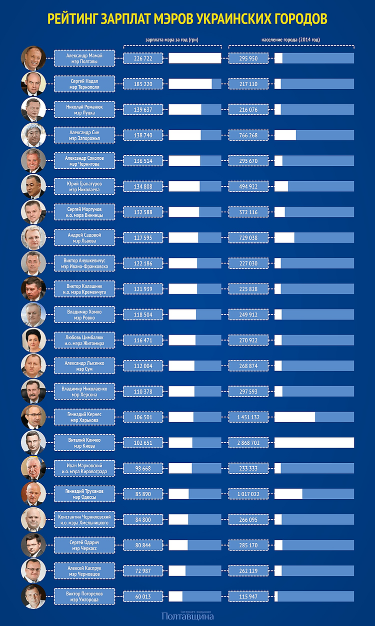 Так, за минувший год Гранатуров получил 134 тысячи 808 гривен зарплаты. По этому показателю он существенно уступает лидеру рейтинга, скандальному мэру Полтавы Александру Мамаю, который с отрывом обогнал всех своих коллег, получив со всеми премиями и надбавками 226 тысяч 722 гривны.