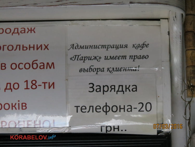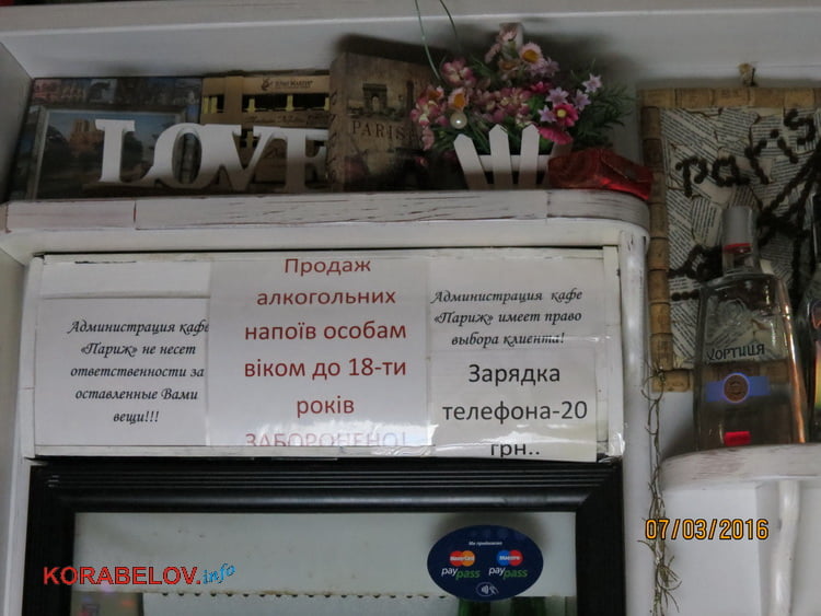 Обращаюсь к людям, которые, как и я, небезразличны к такому виду невежества и которые каким-то образом пострадали от некачественного обслуживания в кафе «ПАРИЖ», которым пришлось промывать желудки и пить активированный уголь от еды, которую подают в этом заведении — ПРОШУ ОТКЛИКНУТЬСЯ И ОБРАТИТЬСЯ С ПИСЬМОМ на этот сайт (korabelov.info@ukr.net)!!! КТО ЗА ПРИЯТНОЕ ОБСЛУЖИВАНИЕ и КАЧЕСТВЕННУЮ ЕДУ, ОТКЛИКНИТЕСЬ !!!