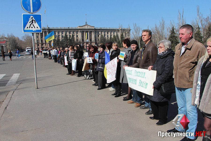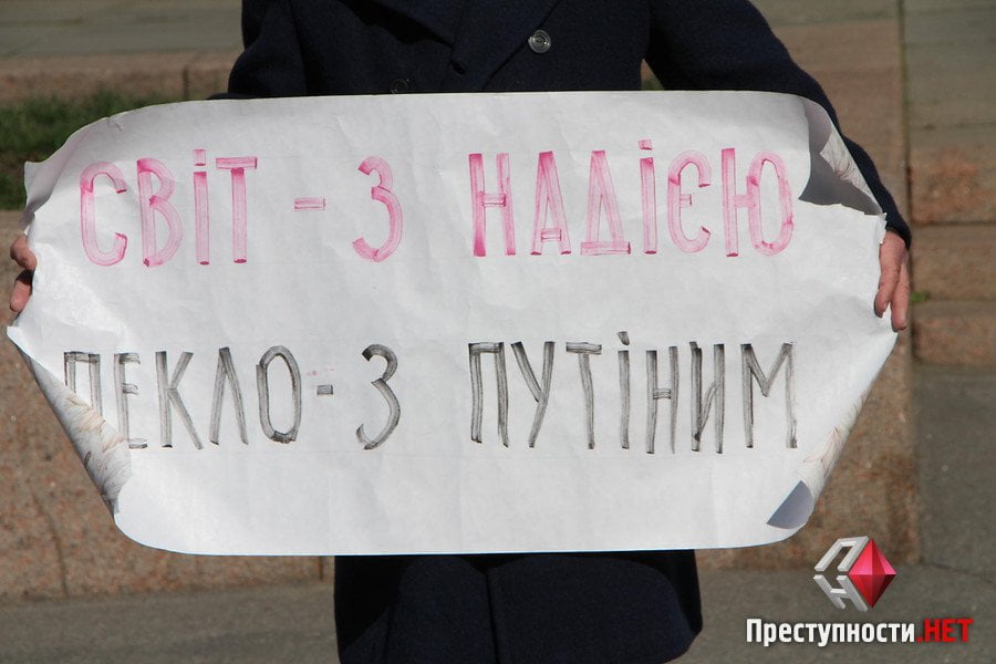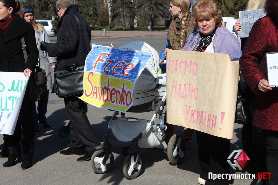 Кроме плакатов с надписями «#FreeSavchenko», «Свободу Надежде Савченко», «Мир — с Надеждой, ад – с Путиным», «Надежда – жива», николаевцы также держали плакаты против русского террора: «Кремль – вечный очаг международного терроризма», «Кремль любит боеголовки и ненавидит людей».
