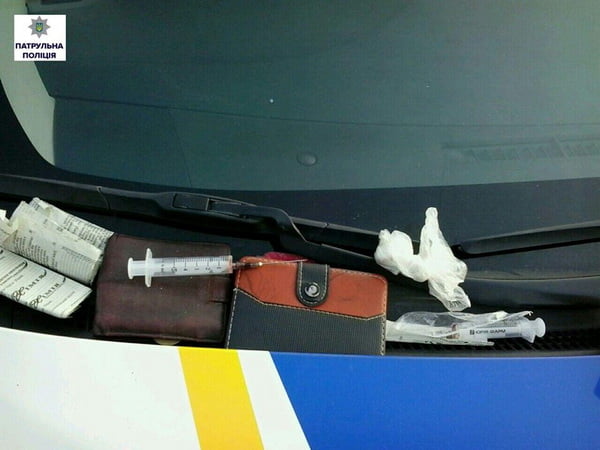 Під час спілкування з водієм – порушником інспектори побачили у нього явні ознаки сп’яніння. Крім того, в салоні авто вони виявили медичний шприц та кілька паперових згортків, тож викликали на місце події слідчо-оперативну групу відділу поліції.
