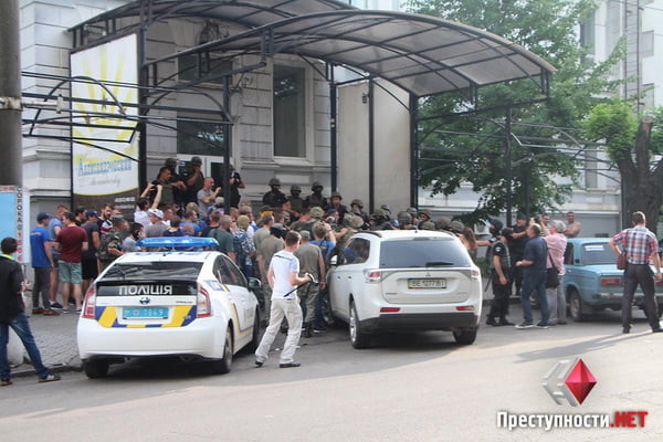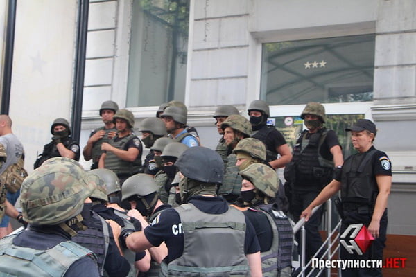На форум пытались прорваться одетые в камуфляж представители одесской «самообороны» и митингующие под Николаевской ОГА. Также с ними были представители николаевского «Гражданского корпуса «Азов» (не были одеты в камуфляж).