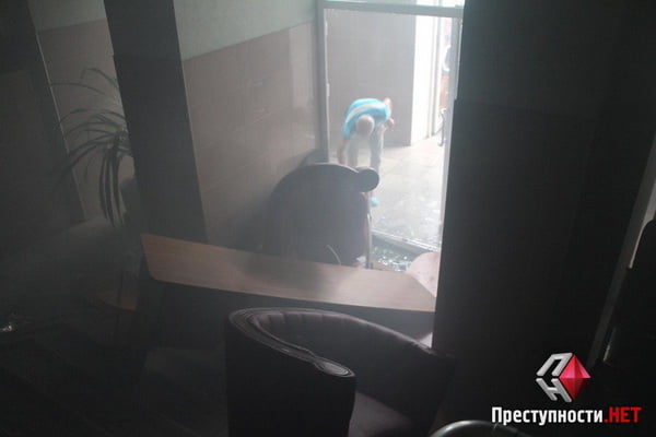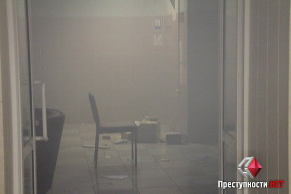 Холл отеля затянут дымом от дымовых шашек и слезоточивым газом, в холле беспорядок, часть мебели разбита. Эту мебель участники форума партии Клименко использовали в качестве баррикады.