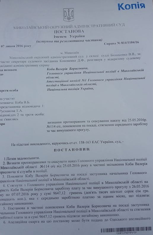 В частности суд постановил удовлетворить иск Валерия Борисовича Кобы к ГУ Национальной полиции в Николаевской области и аттестационной комиссии о признании противоправным и отмене приказа от 25.05.2016г. № 114 о/с, возобновлении в должности и взыскания среднего заработка за время вынужденного прогула.