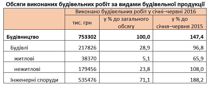 У порівнянні з січнем–червнем 2015 р. індекс будівельної продукції склав 147,4%.