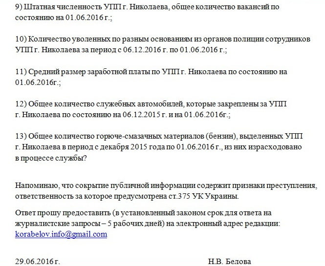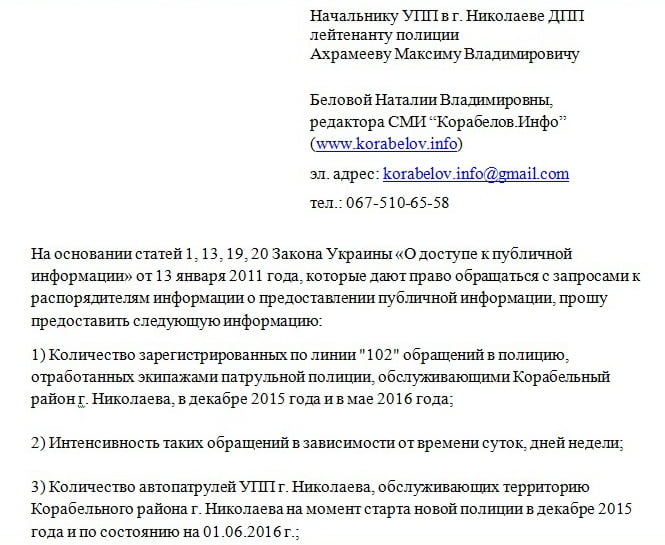 Журналисты «Корабелов.Инфо» решили подвести итоги первых 6 месяцев функционирования новой патрульной службы и выяснить, как ее работа сказалась на обычных жителях Корабельного района г. Николаева, для чего нами 30.06.2016 года был отправлен соответствующий информационный запрос на имя руководителя УПП в г. Николаеве лейтенанта полиции Максима Ахрамеева: