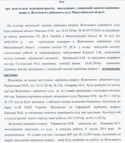 Перевірку було проведено 16.03.2016 р. на підставі доповідної записки керівника апарату Жовтневого районного суду Панімаш Н.М. від 14 березня 2016 року. Перевіркою у складі трьох осіб з ТУ ДСА — Корзуна А.В., Янковської А.М. та Султанської М.А. — було встановлено, що у Жовтневому районному суді з 03.12.2014 року до 05.11.2015 року, а саме протягом всього періоду своєї роботи, кур’єр Конарева М. Л. не з’являлась на робочому місці. Незважаючи на це, кур’єр суду протягом усього часу отримувала заробітну плату: з грудня 2014 по січень 2015 року (за 2 місяці) їй було нараховано 1738 грн (табелі робочого часу підписувала заступник керівника апарату (на той час виконувала його обов’язки) Торжинська М.В.; з лютого по жовтень 2015 року (за 9 місяців) — 11 774, 19 грн (за підписами керівника апарату Панімаш Н.М.). Крім того, Торжинська М.В. за один місяць «роботи» нарахувала Конаревій 10% премії від посадового окладу, а Панімаш Н.М. в період лютого-жовтня 2015 року — в середньому 20% премії, а також наказом у червні 2015 року надала незаконній «робітниці» відпустку з виплатою матеріальної допомоги у розмірі посадового окладу.