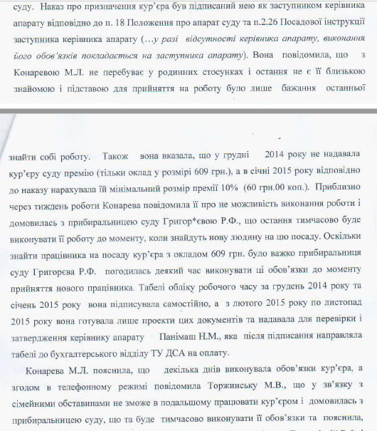Конарева М.Л. через декілька днів після влаштування на роботу начебто повідомила в.о. керівника апарату Торжинську М.В. про те, що у зв’язку з сімейними обставинами не зможе працювати і що вона домовилась з прибиральницею суду Григор’євою Р.Ф., аби та виконувала її обов’язки. За словами Конаревої, заробітну плату (в тому числі за грудень 2014) та зарплатну картку вона віддала прибиральниці. Також акт зазначає, що письмові пояснення Григор’євої Р.Ф. підтверджують факт того, що Конарева М.Л. декілька разів відносила з нею кореспонденцію до адресатів.