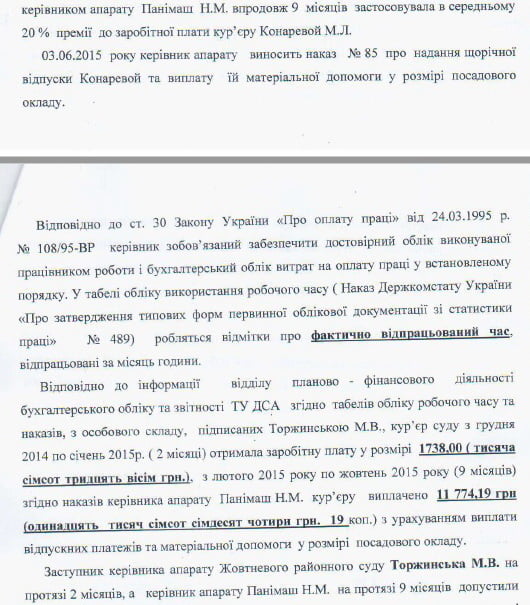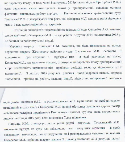 Керівництво суду свідомо на протязі тривалого часу заповнювало «липові» документи по заробітній платі і зазначало «фальшивого» працівника (Конареву М.Л.). На протязі тривалого часу в цьому суді присвоювалась заробітна плата працівника, якого не існувало, в той час як інші працівники отримували меншу зарплату…