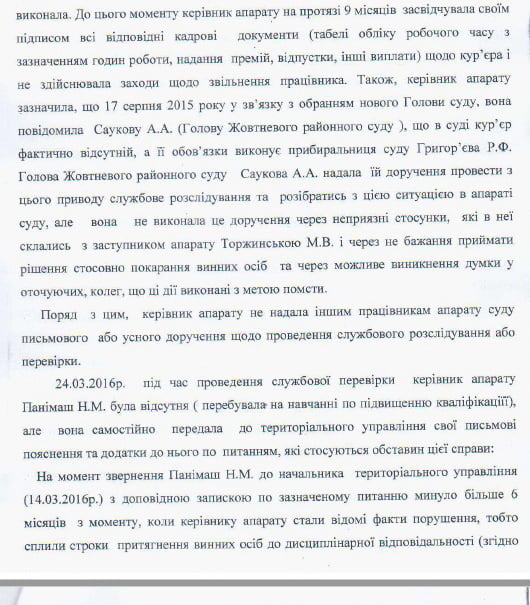 Згодом на посаду керівника апарату була призначена Панімаш Н.М. Як зазначено в акті, Панімаш Н. М. пояснила, що Торжинська М.В. особисто повідомила її про ситуацію у суді. Панімаш Н.М. у свою чергу повідомила про це Саукову А.А, яка була призначена Головою суду 17 серпня 2015 року. Остання доручила керівнику апарату з цього приводу провести службове розслідування…