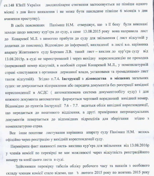 Панімаш Н.М. на питання, звідки вона знає про відповідь юридичного сектору ТУ, відповіла, що чула про це, але документу не бачила. Також варто зазначити, що керівник апарату написала доповідну в ТУ 14. 03. 2016 р., коли Конареву було звільнено майже 4 місяці тому (а саме 05.11. 2015 р.). Такі дії Панімаш Н.М. пояснила тим, що хотіла, аби знали про цю ситуацію, та розуміла, що мусить це зробити, аби потім не звинувачували в усьому її.