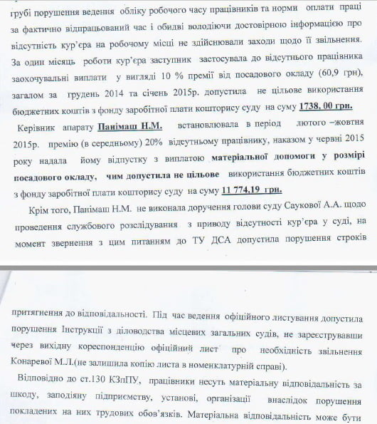На питання, чому окрім зарплати відбувалось і нарахування премій та відпустки з виплатою матеріальної допомоги, і чи не може це бути свідченням того, що гроші були привласнені навмисно, Голова суду відповіла, що жодних висновків та рішень з цього приводу немає і подібні судження є лише особистими висновками журналіста. Також у розмові Саукова А.А. ствердила, що була призначена Головою суду у серпні, а повідомила її про ситуацію з кур’єром керівник апарату Панімаш Н.М. у жовтні. За словами Голови суду, про такі порушення вона б могла і не знати, якби їй не доклала керівник. Щодо наслідків перевірки та подальших дій Голова суду порадила звернутись до ТУ ДСА.