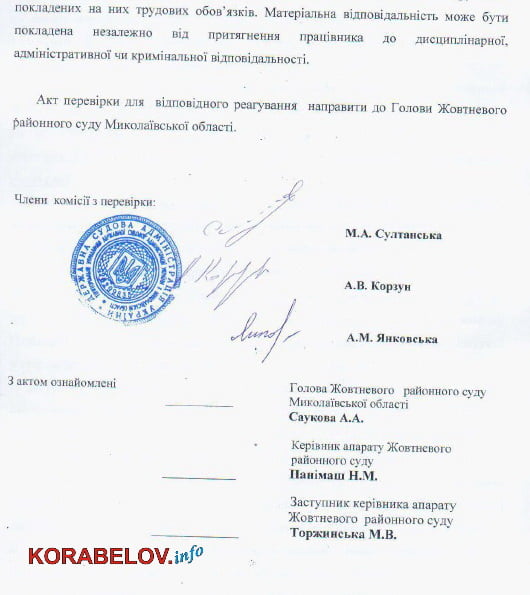 Збори нашого суду прийняли до уваги даний акт, але у зв’язку з тим, що пройшли усі терміни притягнення до дисциплінарної відповідальності, відповідно до закону про державну службу, а питання притягнення до відповідальності керівника та заступника керівника стосується повноважень начальника територіального управління, було надіслано відповідне рішення начальнику ТУ. Збори суддів також рекомендують ТУ вимагати з винних осіб погашення збитків та заподіяної шкоди.