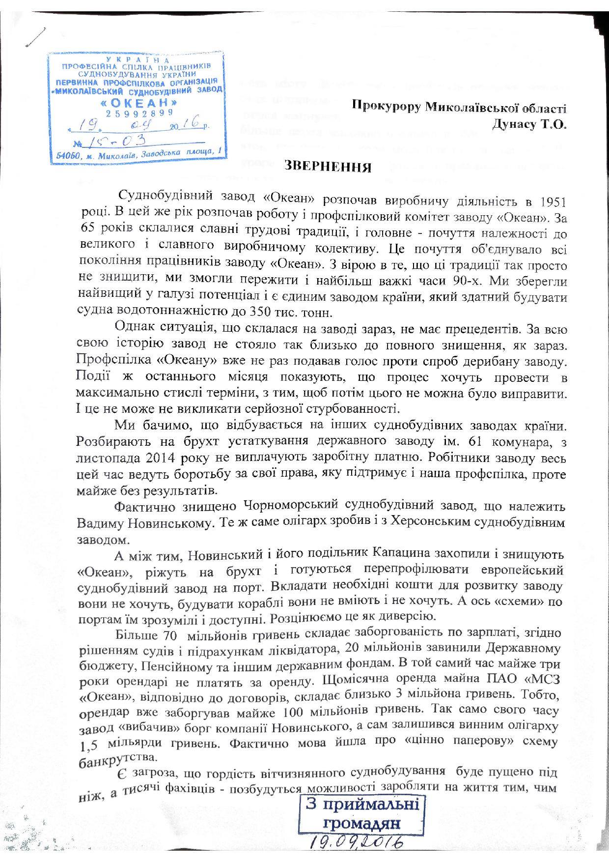 Профспілка ППО «МСЗ «Океан» звернулась до прокурора Миколаївської області Дунаса. В своєму зверненні вони стверджують, що за всю свою історію завод не був так близько до повного знищення, що Новинський і його подільник Капацина захопили і знищують «Океан», ріжуть на брухт і готуються перепрофілювати європейський суднобудівний завод на порт.