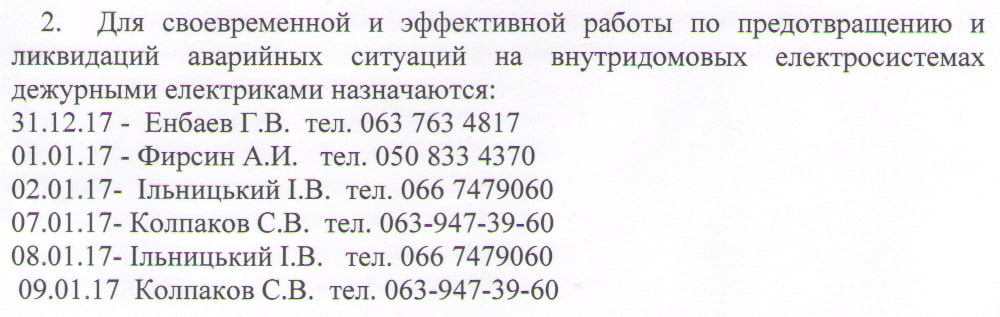В связи с предстоящими праздничными днями, руководство КП «Гуртожток» назначило дежурных слесарей-сантехников и электриков.