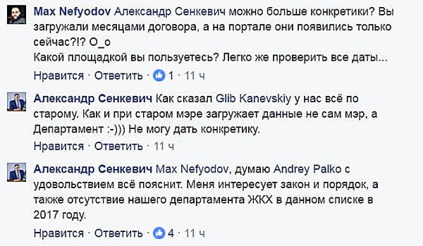 В свою очередь городской голова Николаева Александр Сенкевич, комментируя публикацию Нефедова, отметил, что такая сумма неконкурентных допороговых закупок обусловлена тем, что бюджет в части Департамента ЖКХ был принят только в апреле 2016 года. При этом он напомнил о том, как СМИ сообщили о том, что мэрия Николаева 2 января 2017 без проведения торгов «раздала» 13,3 миллиона гривен на благоустройство города и опубликовал комментарий Департамента ЖКХ, в котором там, эту информацию называли фейковой и объяснили причину публикации такого числа заключенных договоров, сбоем платформы закупок.
