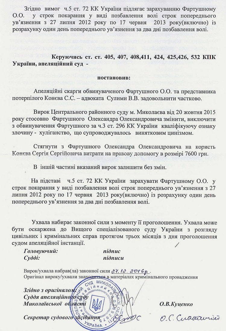 Что касается срока лишения свободы, то судьи оставили приговор без изменений, назначив наказание Александру Фартушному в виде тюрьмы на срок 2 года и 1 месяц. Однако, Апелляционный суд постановил засчитать срок, который экс-милиционер уже «отсидел» в СИЗО Николаева во время следствия в счет выполнения наказания, однако, с применением нормы «Закона Савченко»: ссылаясь на часть 5 статьи 72 Уголовного кодекса Украины суд смягчил наказание милиционеру-хулигану, засчитав срок его нахождения в СИЗО по формуле день за два.