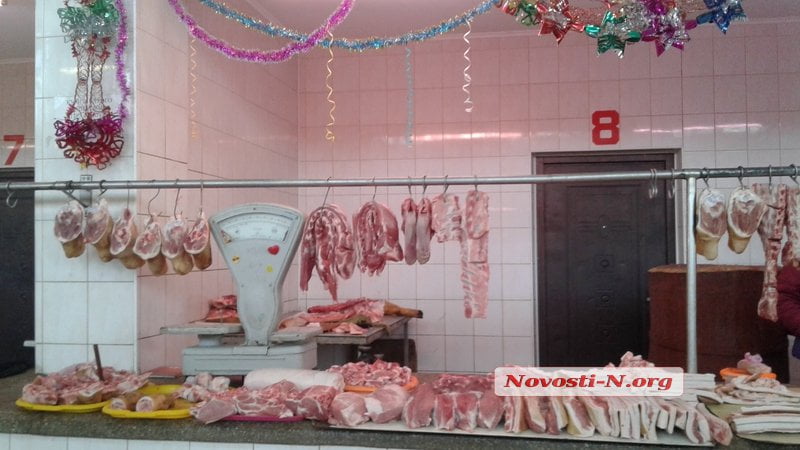 Лучшим местом для покупки мяса, без которого не представляет свой дневной рацион практически любой николаевец, остается мясной павильон. Цены на свинину зависят от вида мяса. Так, мякоть стоит от 75грн до 80 грн за кг, шея — 85 грн, рёбра — от 60 грн до 65 грн, подчеревок — 60 грн, балык — 85 грн, сало — от 15 грн до 50 грн. Мякоть говядины можно найти как за 95 грн, так и за 120 грн за кг. Стоимость курицы также зависит от вида мяса: тушка стоит 39,9 грн, филе — 69,9 грн, бёдра — 52,5 грн, окорочка — 36,9 грн, печень — 48 грн за кг. «Лидером» по цене среди мясной продукции стала домашняя колбаса, стоимость которой стартует от 140 грн за кг.