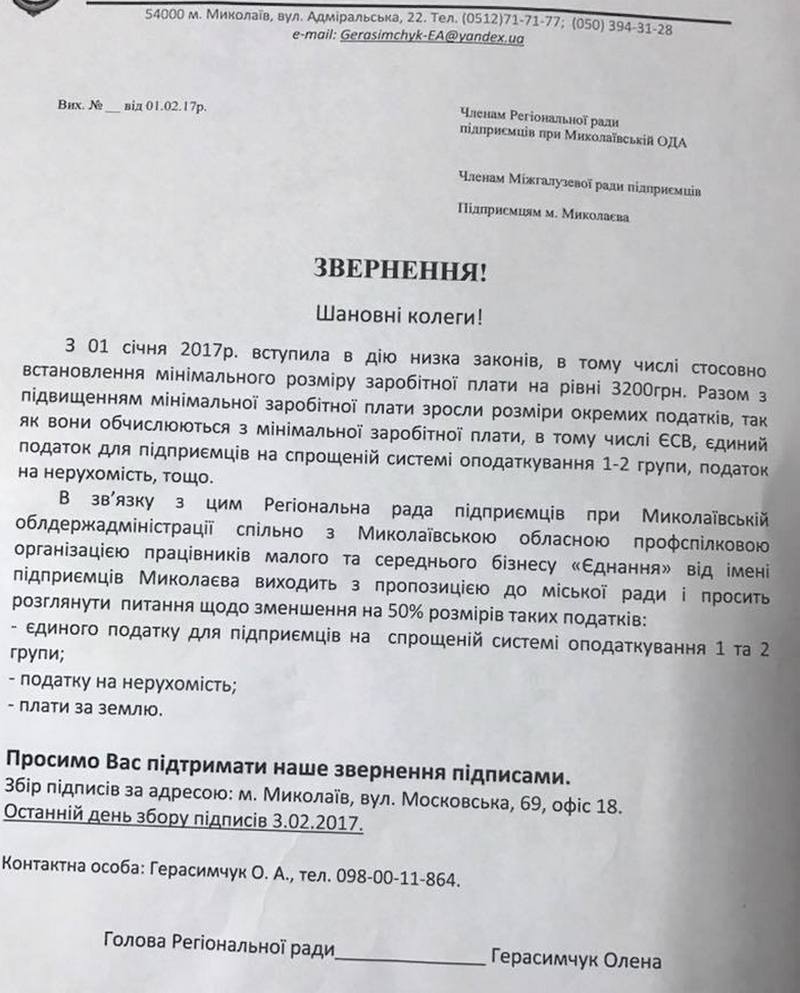Региональный Совет предпринимателей при Николаевской облгосадминистрации, и профсоюз малого и среднего бизнеса «Єднання» считают, что рост ряда налогов, вызванных повышением минимальной заработной платы до 3200 грн. , стал непосильным для малого бизнеса.