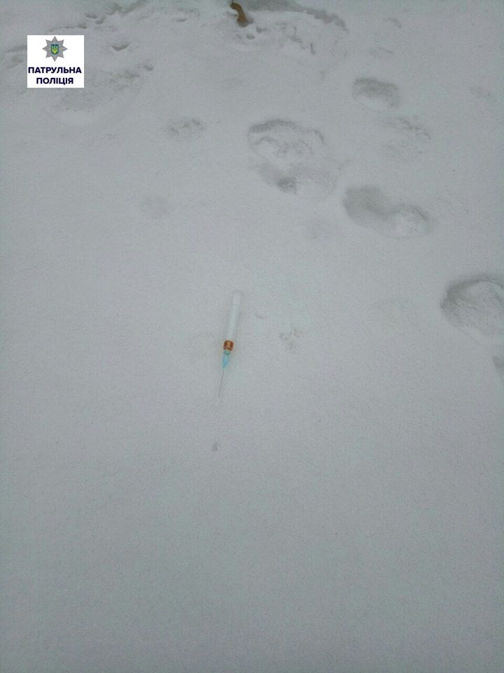 При наближенні до нього, інспектори побачили як він кинув на сніг медичний шприц з коричневою речовиною, повідомили в патрульній поліції.