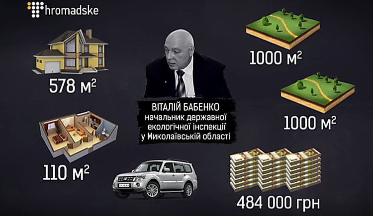 Кроме того, согласно декларации за 2015 год, Бабенко владеет двухкомнатной квартирой в новом доме (110 кв.м), внедорожником, 484 тысячами гривен и двумя земельными участками по 10 соток каждый.