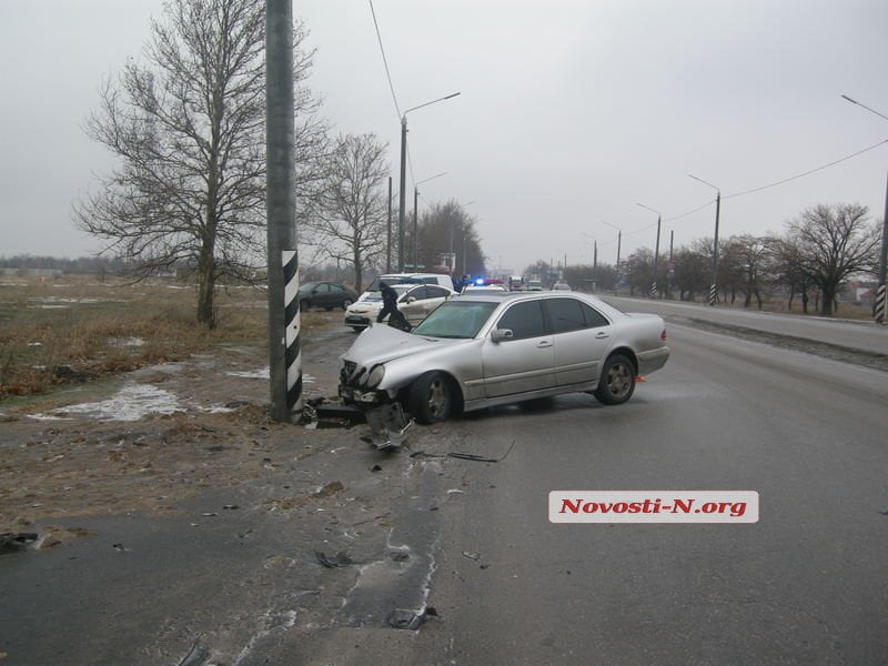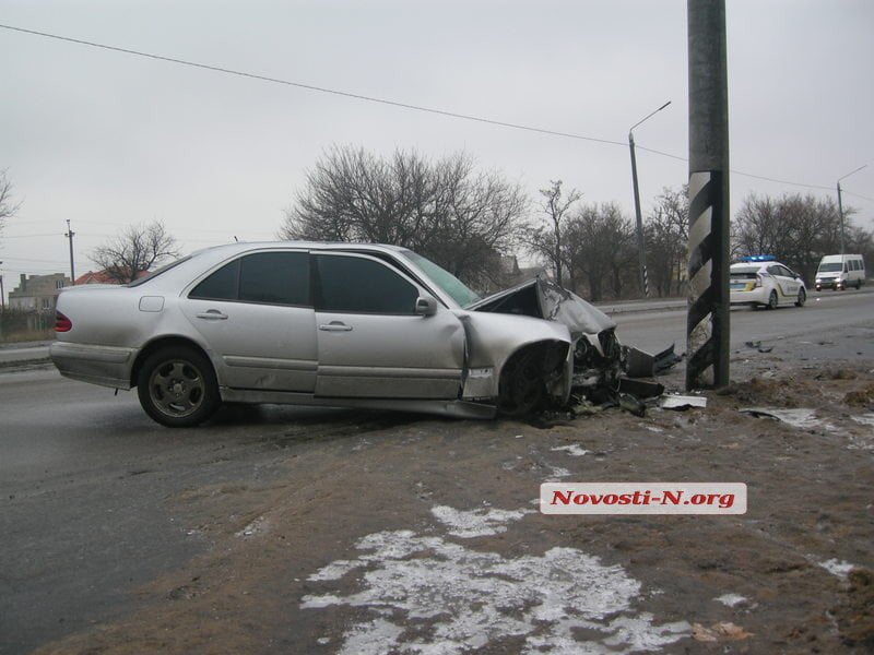 Утром во вторник, 7 февраля, на проспекте Богоявленском (бывшем пр. Октябрьском) в Николаеве легковой автомобиль Mercedes выехал за пределы проезжей части и врезался в столб.
