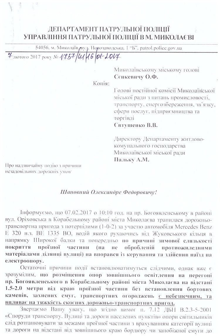 Ранее сообщалось, что 7 февраля в 10:10 на проспекте Богоявленском случилось ДТП, в котором, по уточненной информации, получили травмы два человека. Водитель «Mercedes Benz E320», двигаясь от Жуковского кольца в направлении Широкой балки, из-за скользкой дороги не справился с управлением и врезался в электроопору. Данная авария вызвала обсуждение в социальных сетях – николаевцы указывали, что если бы дорога на перегоне была оборудована отбойниками, то возможно обошлось бы без пострадавших.