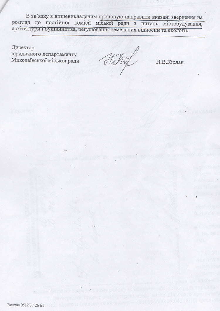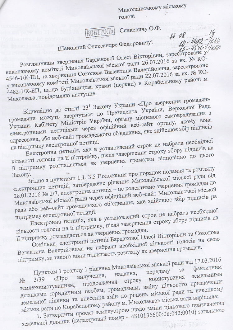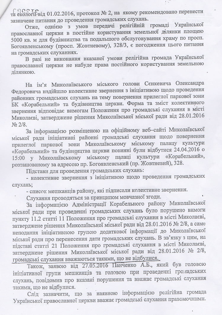 Б.Чёрненький начинает ходить по инстанциям и везде предъявлять протокол подсчёта голосов, утверждая, что слушания состоялись, не учитывая тот факт, что результаты должны были быть рассмотрены на сессии горсовета и пройти утверждение согласно процедуре. Неоднократно, глядя в глаза, он лгал мне, представителям администрации и полиции. Началась бумажная война. С момента подачи мной заявления о проведении слушаний, результаты которых согласно букве закона не могут быть признаны, а именно с 27 мая 2016 года, я так и не получил никакого ответа. Всё это время идёт переписка между чиновниками, в которой каждый высказывает своё мнение. Например, в июле сотрудница управления земельных ресурсов Корих А.И. подготовила для подписи начальнику управления Морозу А.И. ответ на имя заместителя главы Корабельной администрации Луцкой А.В., в котором на основании имеющегося у неё протокола слушаний признаёт эти слушания состоявшимися. А в августе директор юридического департамента горсовета Кирлан Н.В. в письме на имя городского головы указывает, что в случае невыполнения условия (проведение слушаний), религиозная громада не получает права пользования земельным участком. Слушания считает несостоявшимися, а далее рекомендуется рассмотреть вопрос на депутатской комиссии.