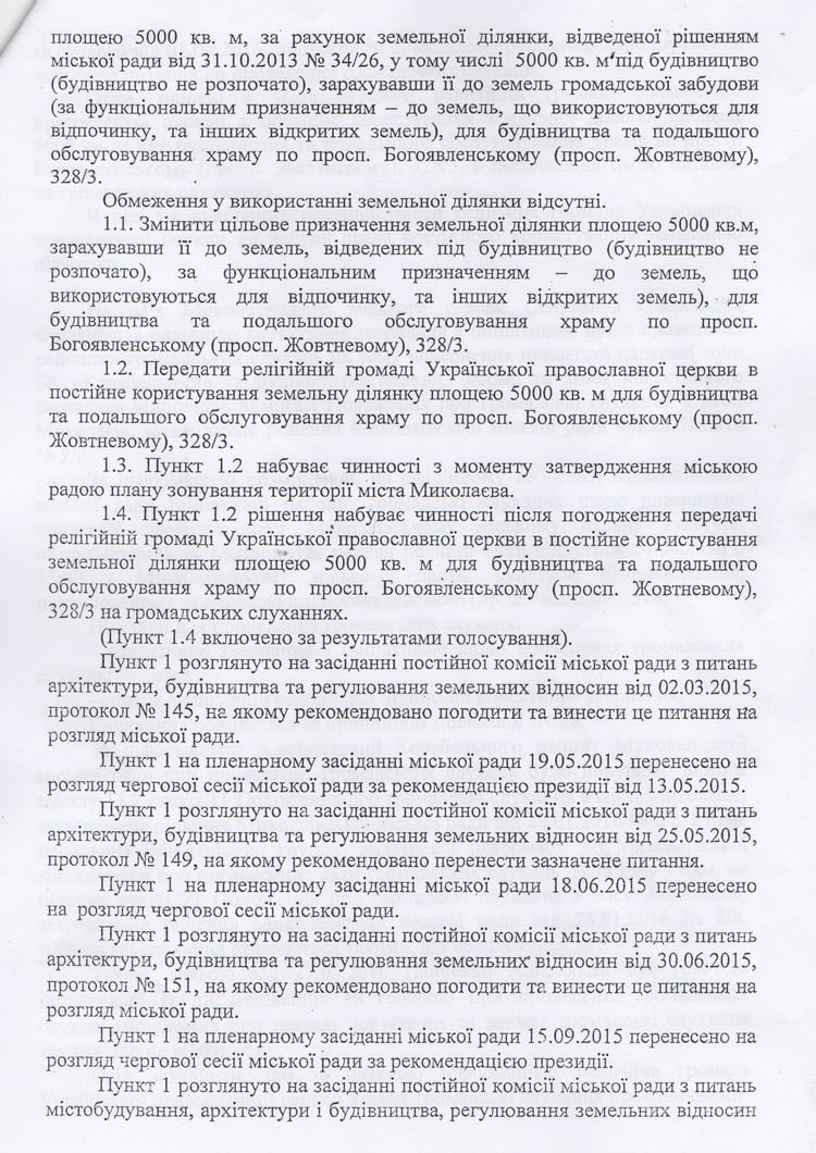 Решением сессии городского совета 17 марта 2016 года принято решение о передаче в постоянное пользование земельного участка под строительство храма за счёт земель парковой зоны Дворца культуры «Корабельный» при условии проведения общественных слушаний. Уже через неделю в нарушение требований решения было оформлено право пользования земельным участком, о чём сделана запись в реестре имущественных прав на недвижимое имущество. Это незаконное решение можно оспорить только через суд. Для этого мы начинаем поиски адвоката и сбор добровольных пожертвований для оплаты искового заявления.