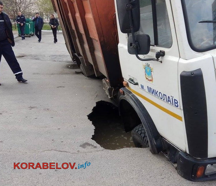 Около 14:00 в понедельник, 10 апреля, во дворе многоэтажек по проспекту Богоявленскому (возле дома № 325/4, недалеко от Балабановского леса) мусоровоз коммунального предприятия «Обрій-ДКП» провалился колесами под асфальт, где проходит канализационный коллектор.