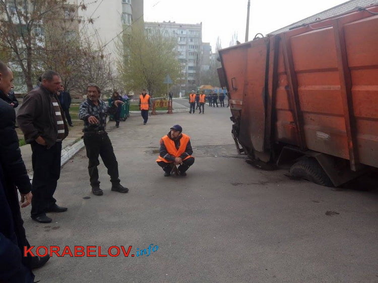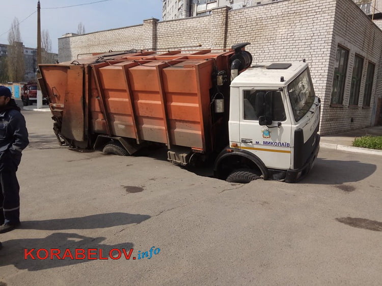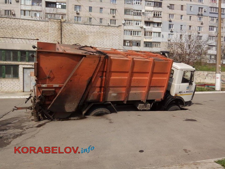 Около 14:00 в понедельник, 10 апреля, во дворе многоэтажек по проспекту Богоявленскому (возле дома № 325/4, недалеко от Балабановского леса) мусоровоз коммунального предприятия «Обрій-ДКП» провалился колесами под асфальт, где проходит канализационный коллектор.