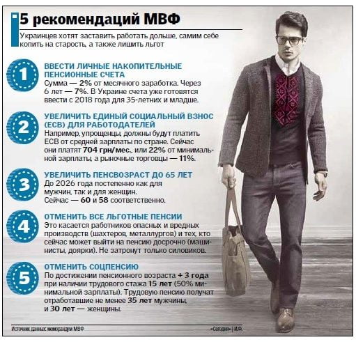 Как видно из инфографики, уменьшить расходы из казны на пенсионеров МВФ советует за счет увеличения пенсвозраста (в меморандуме этого требования нет) и повышения налогового бремени на упрощенцев. А также предлагает отнять право на досрочный выход на пенсию у представителей вредных и опасных профессий, отменить соцпенсии для тех, кто не имеет трудового стажа в 35 лет (для женщин — 30 лет). «Это рекомендации, но их игнорирование может повлиять на дальнейшее сотрудничество с МВФ», — говорит Охрименко.