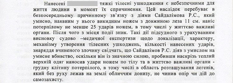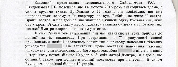 Во время досудебного расследования стало известно о том, что 14 февраля 2016 года около часа ночи несовершеннолетний Руслан Сайдалимов в состоянии алкогольного опьянения, находясь рядом с домом №338 по проспекту Богоявленскому в городе Николаеве, нанес местному жителю Алексею Жадыку не менее 25 ножевых ранений, в том числе 3 колото-резаных ранения, после чего скрылся с места преступления вместе со своим другом Дмитрием.