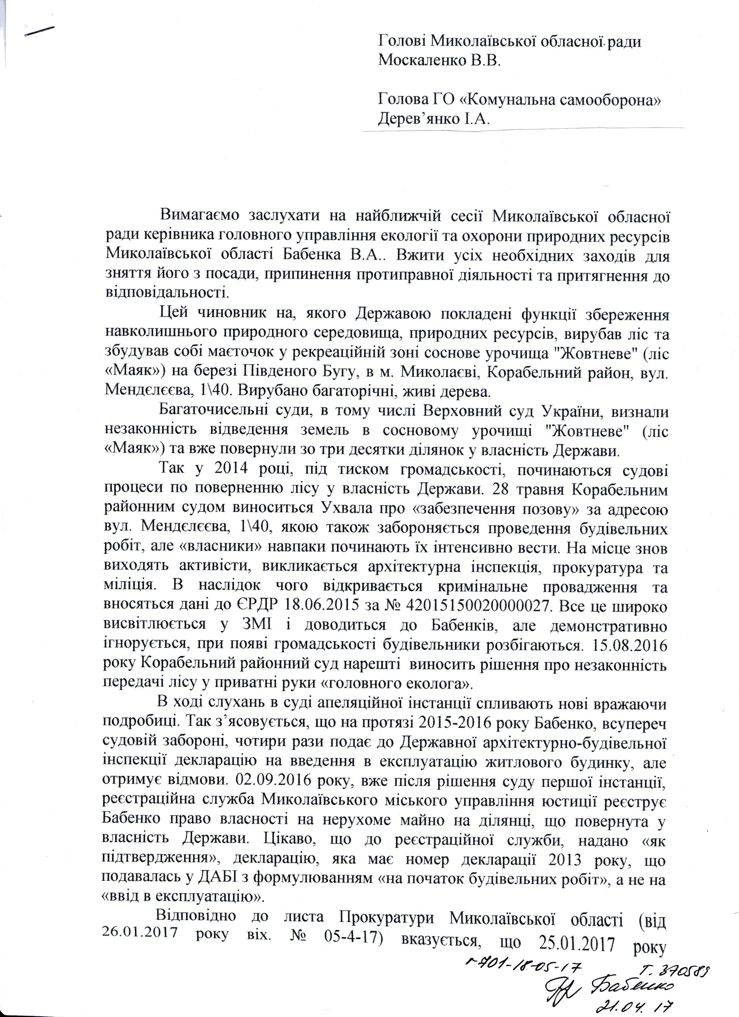 «Вимагаємо заслухати на найближчій сесії Миколаївської обласної ради керівника головного управління екології та охорони природних ресурсів Миколаївської області Бабенка В.А.. Вжити усіх необхідних заходів для зняття його з посади, припинення протиправної діяльності та притягнення до відповідальності.