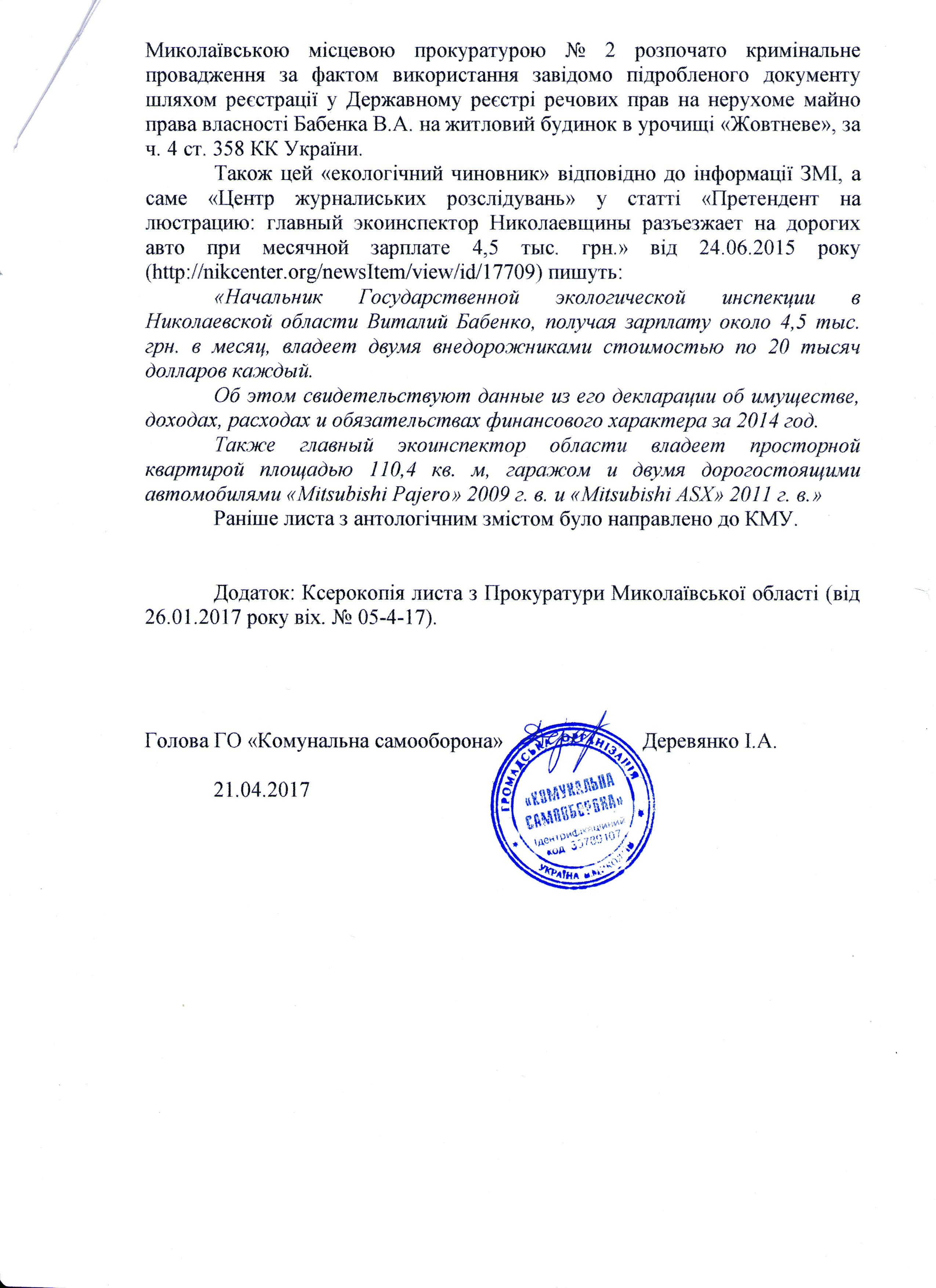 Відповідно до листа Прокуратури Миколаївської області (від 26.01.2017 року віх. № 05-4-17) вказується, що 25.01.2017 року Миколаївською місцевою прокуратурою № 2 розпочато кримінальне провадження за фактом використання завідомо підробленого документу шляхом реєстрації у Державному реєстрі речових прав на нерухоме майно права власності Бабенка В.А. на житловий будинок в урочищі «Жовтневе», за ч. 4 ст. 358 КК України.