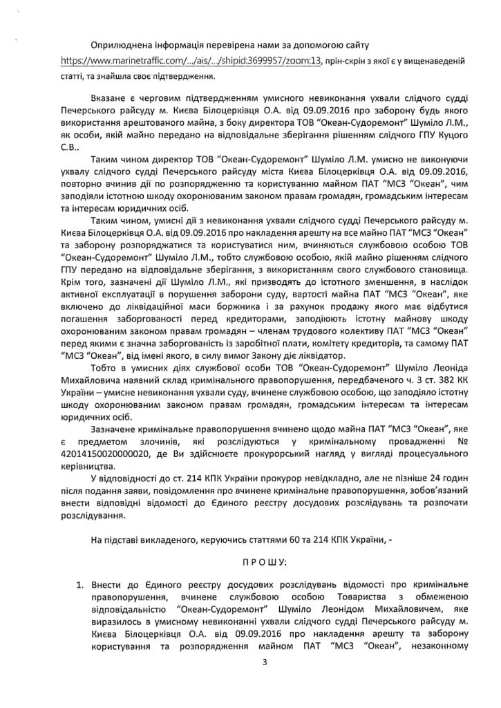 Таким образом, допустив швартовку российского танкера «Виктория», Леонид Шумило повторно осуществил действия по использованию имущества ПАО НСЗ Океан. И в умышленных действиях Л.М.Шумило присутствует состав уголовного правонарушения, предусмотренный ч.3 ст.382 УК Украины — умышленное невыполнение постановления суда, совершенное должностным лицом, которое нанесло существенный вред охраняемым законом правам граждан, общественным интересам и интересам юридических лиц. На основании этого адвокат ликвидатора ПАО НСЗ Океан просит внести данные про совершенное преступление в Единый госреестр досудебных расследований и принять все возможные меры по прекращению преступной деятельности лиц, которые незаконно пользуются и распоряжаются имуществом ПАО НСЗ Океан, и по привлечению этих лиц к уголовной ответственности.