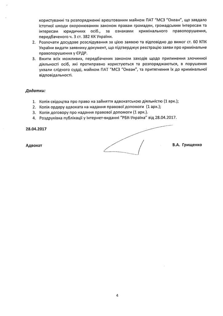 С соответствующим заявлением о совершении уголовного правонарушения к Генеральной прокуратуре обратился адвокат ликвидатора ПАО НСЗ Океан Ирины Сербин — советник АО ЮФ Ario Владислав Грищенко.