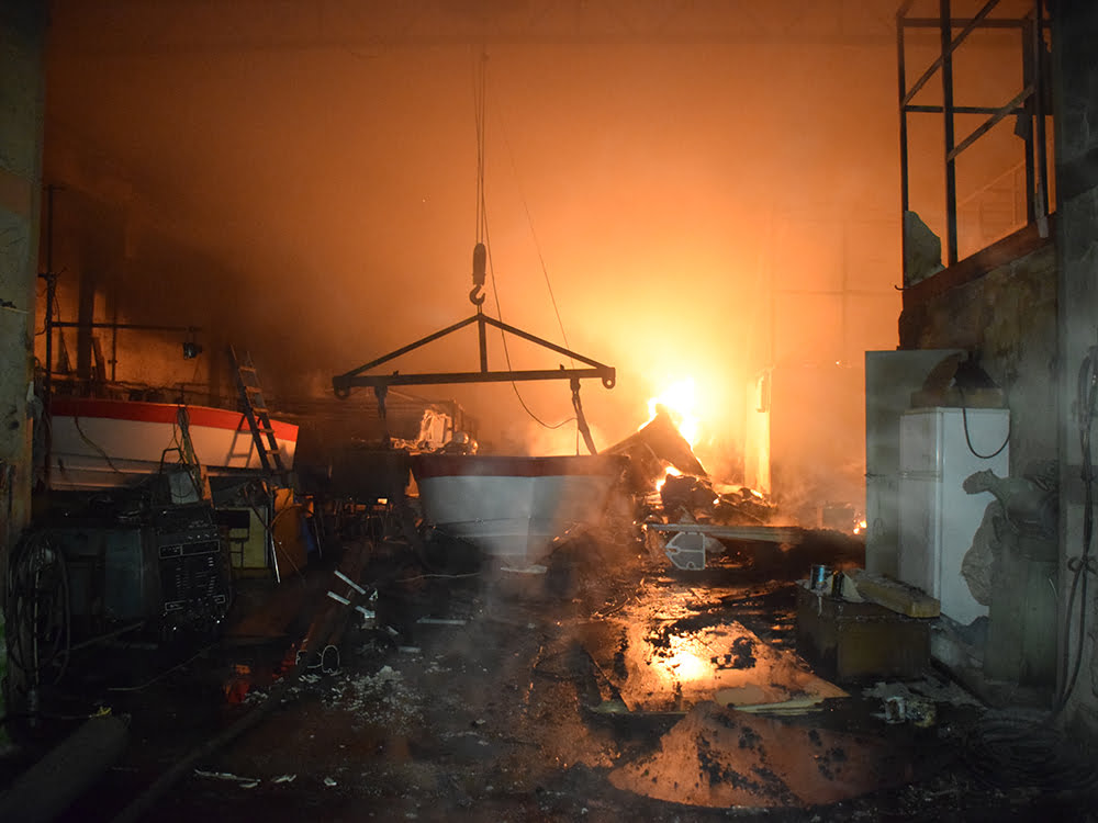 На місце направлено два пожежно-рятувальні відділення 4 Державної пожежно-рятувальної частини по охороні Інгульського району міста. По прибуттю встановлено, що горить приміщення по виробництву яхт, човнів на площі 300 м.кв. Загальна площа приміщень становить біля 4500 м.кв.