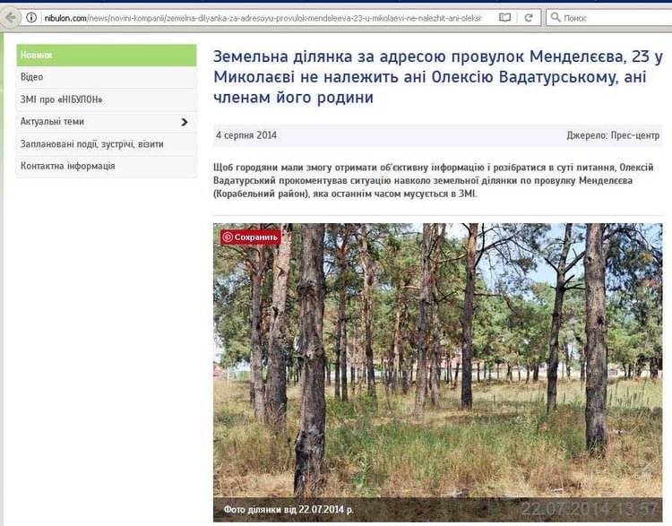 Земля була відведена власнику «НІБУЛОНа» Рішенням Миколаївської міської ради 14.03.2008 року з формулюванням: «За рахунок земель ДП «Миколаївське лісове господарство….». Навесні — початку літа 2014 року починаються та набувають широкого розголосу протести громадськості за повернення лісу «Маяк» у власність Держави. 22 липня 14-го Вадатурський раптово продає землю за адресою пров. Менделєєва, 23 громадянину Шляховському О.С.
