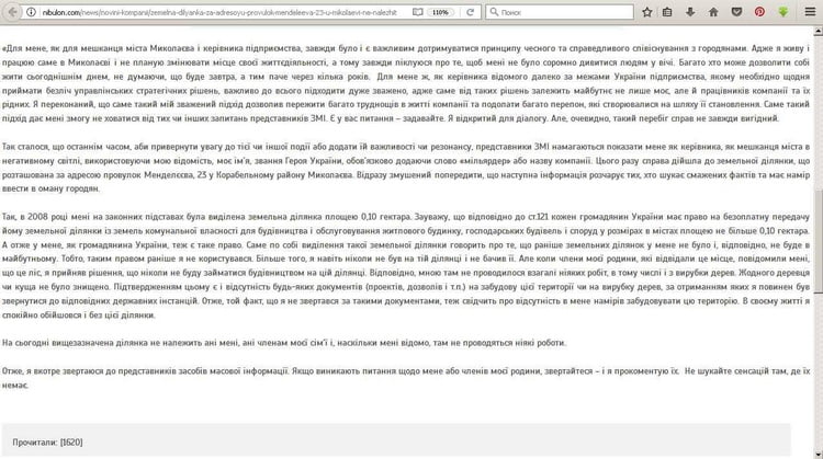 На засідання прийшла громадськість. Мене ще раніше було залучено до розгляду цієї судової справи у якості третьої особи, тож я надав суду копію публікації від 4 серпня 2014 р. на офіційному сайті «НІБУЛОН» під назвою «Земельна ділянка за адресою провулок Менделєєва, 23 у Миколаєві не належить ані Олексію Вадатурському, ані членам його родини», де наводились його слова:
