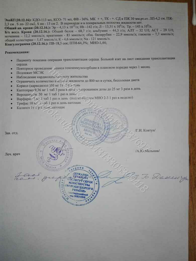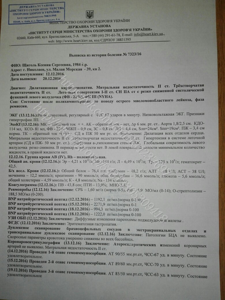Но друзья и волонтеры подсказали мне обратиться в инст. Сердца, г. Киев, лично к Тодурову Б.М. — это наш украинский светило кардиохирургии. И я не ошиблась… За 5 минут он опроверг диагноз и поставил новый: ДИЛАТАЦИОННАЯ КАРДИОМИОПАТИЯ.