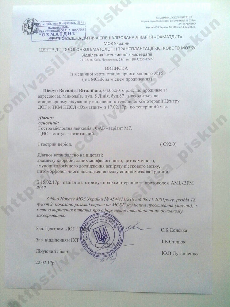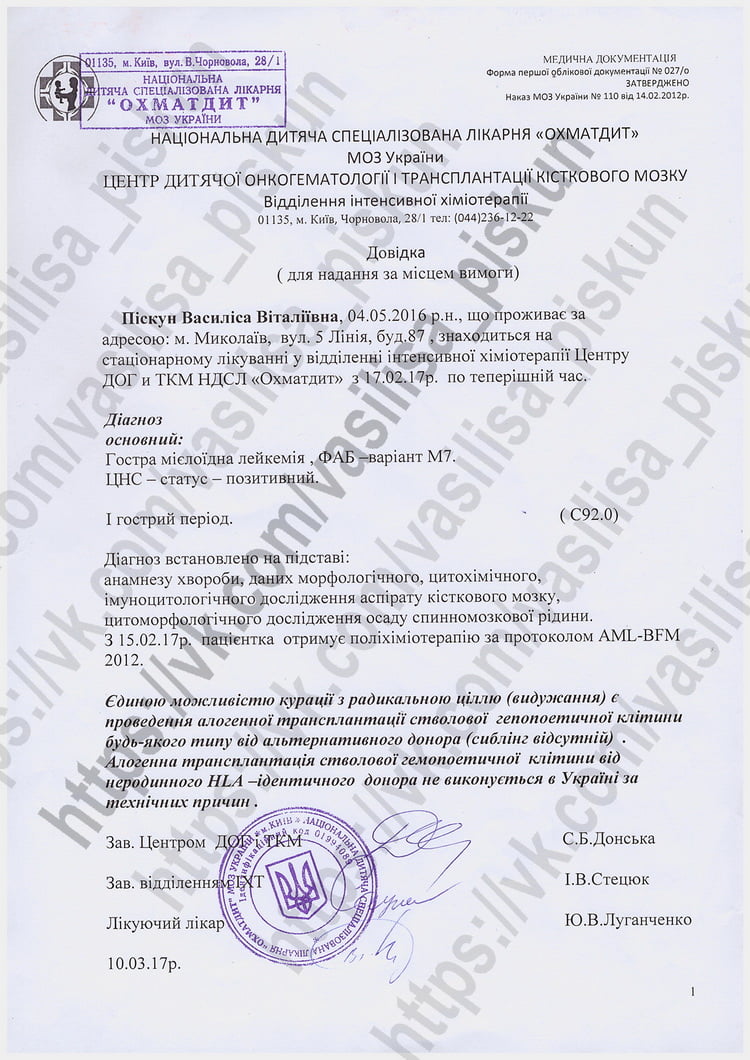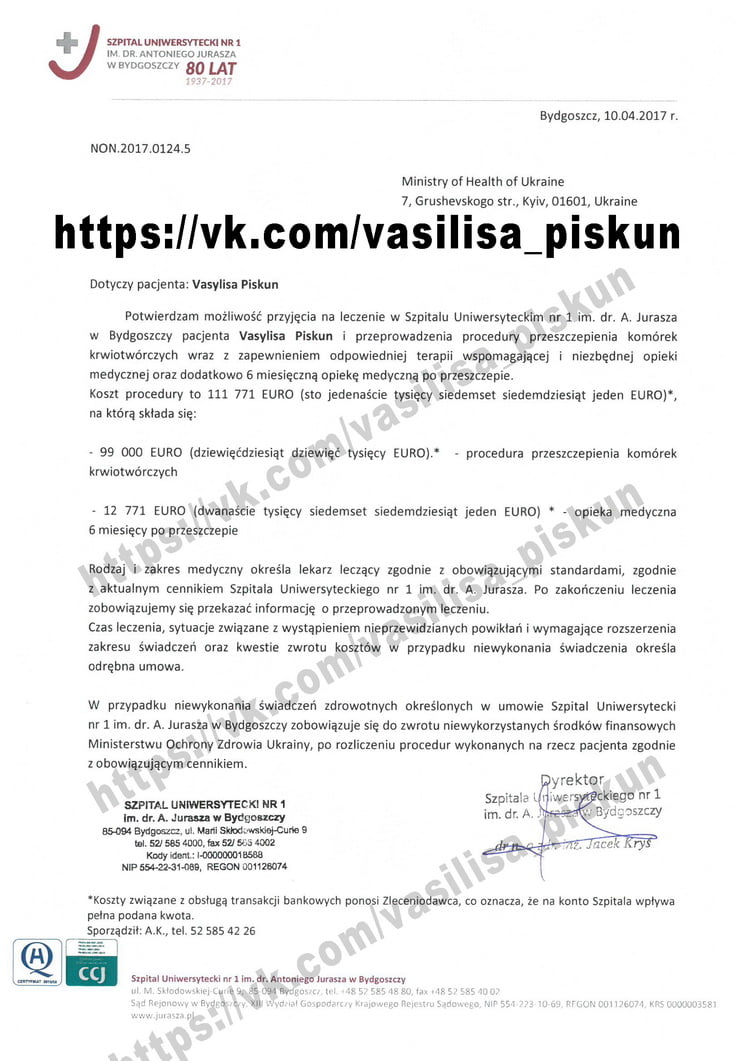 Родители подали документы в МОЗ Украины, но им негласно посоветовали не ждать денег в ближайшее время. Польская клиника прислала письмо, что гарантийные письма она от Украины не принимает. А деньги нужны были срочно. В онкологии важна СВОЕВРЕМЕННОСТЬ!!! Каждый упущенный день может стоить Василисе ЖИЗНИ! После пересадки костного мозга есть огромнейшие шансы для Василисы стать обычным здоровым ребеночком. Надо только заплатить!!!