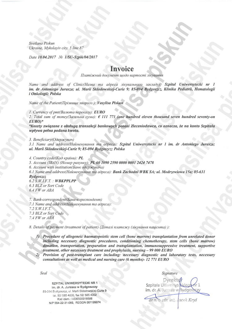 В Украине девочку вылечить невозможно, нет регистра доноров. Родители обратились во многие мировые клиники с достаточным опытом лечения подобного заболевания, и из всех предложенных вариантов была выбрана клиника с наименьшим счётом. Это университетская клиника им. Юраша (Польша), где Василису ждут уже в средине июня при условии полной оплаты лечения. Необходимая сумма — 142 216 евро (4 074 450 грн), эту сумму необходимо было собрать срочно.