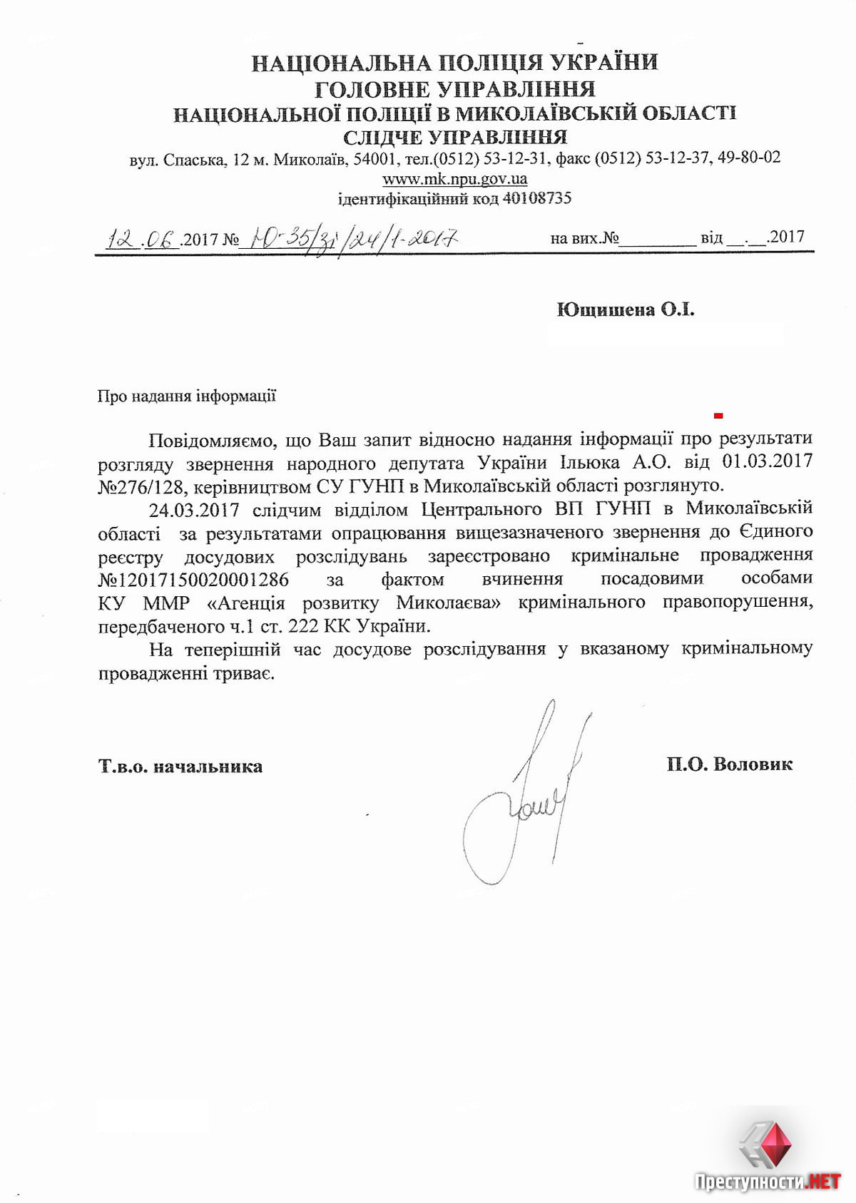 Об этом идет речь в ответе на запрос корреспондента «Преступности.НЕТ».