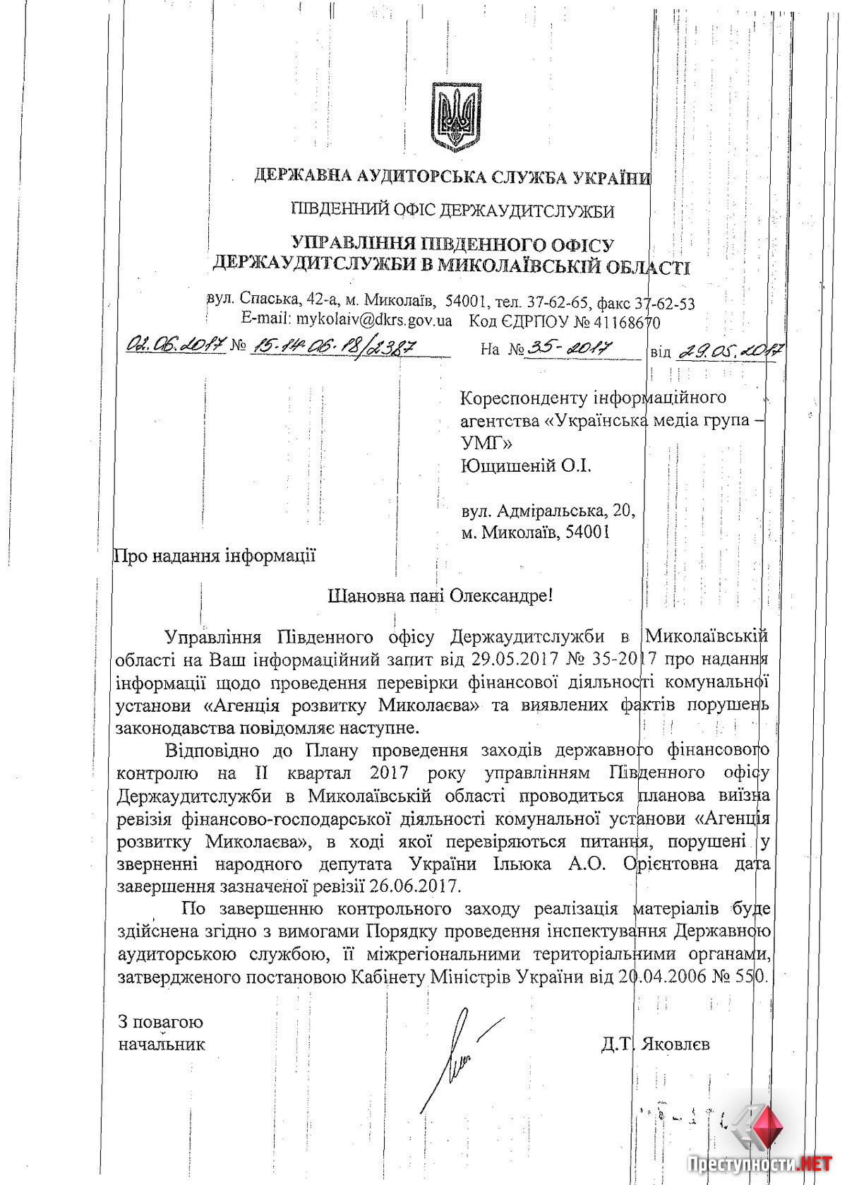 В свою очередь, начальник управления Южного офиса Госаудитслужбы в Николаевской области Денис Яковлев в ответе на запрос корреспондента «Преступности.НЕТ» сообщил, что на данный момент времени в КУ «Агентство развития Николаева» проходит плановая проверка финансовой деятельности учреждения, которая продлится до 26 июня.