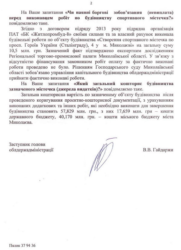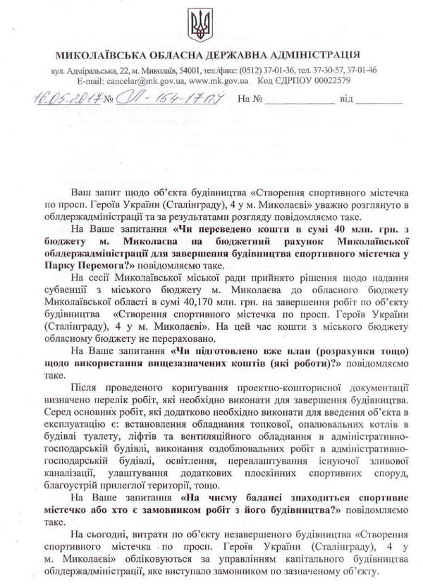 Замечательно, значит, когда деньги просили, знали, что сумма 30 миллионов именно та, которой хватит на завершение строительства, снова таки, согласно сметной документации. Но, удивительное рядом – состоянием на июнь смета не готова, что подтвердил документом сам профильный заместитель главы ОГА.